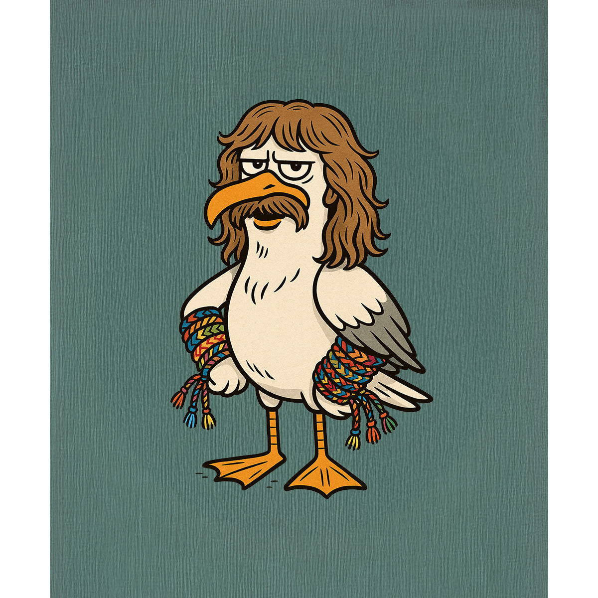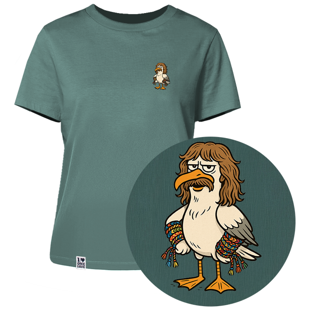 Dieses besondere Damen Shirt erzählt Geschichte – mit einem ganz eigenen Augenzwinkern und maritimer Lebensfreude. Die freche Möwe, lebendig als Cartoon-Motiv gestaltet, steht für Humor, Individualität und nordischen Charme. Ihr markanter Schnurrbart und die bunten Freundschaftsarmbänder machen jeden Tag ein bisschen bunter – inspiriert von der unbeschwerten Küstenkultur Norddeutschlands.
