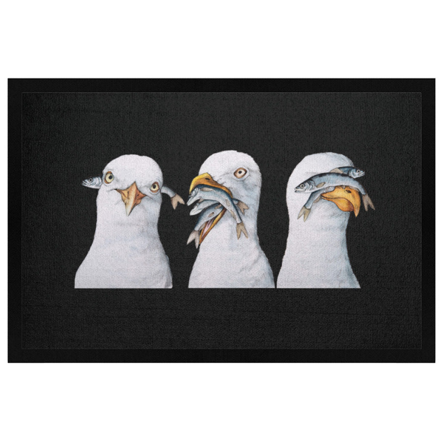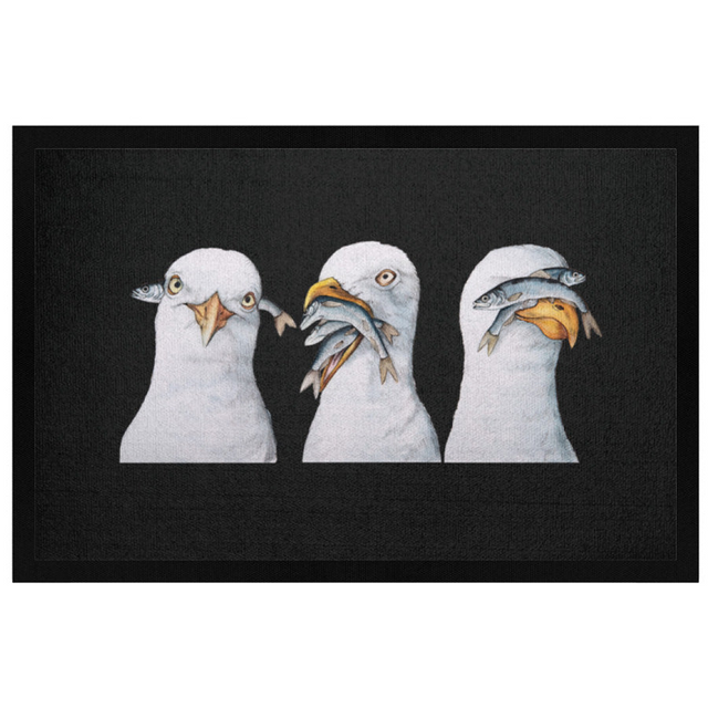 Diese Fußmatte mit frechem Möwendesign bringt den Charme der Nordsee direkt in deinen Eingangsbereich. Drei einzigartige Möwen, jede mit ihrem eigenen skurrilen Blick und voller Fischangebot, heißen dich herzlich willkommen – ein echter Eyecatcher, der mit Humor und maritimer Leichtigkeit deine Gäste empfängt.