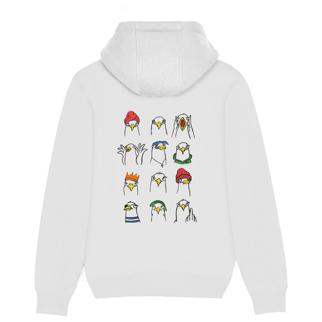 Fühl die sanfte Brise der Küste auf deiner Haut. Unser Möwen Collage Hoodie nimmt dich mit auf eine Reise ans Meer. Mit jedem Tragen spürst du die Freiheit und Weite der Wellen. Die Möwen, Symbol für Freiheit und Abenteuer, schweben leicht über dem strahlenden Weiß. Gönn dir und deinen Liebsten ein Stück Nordsee-Feeling für jeden Tag.