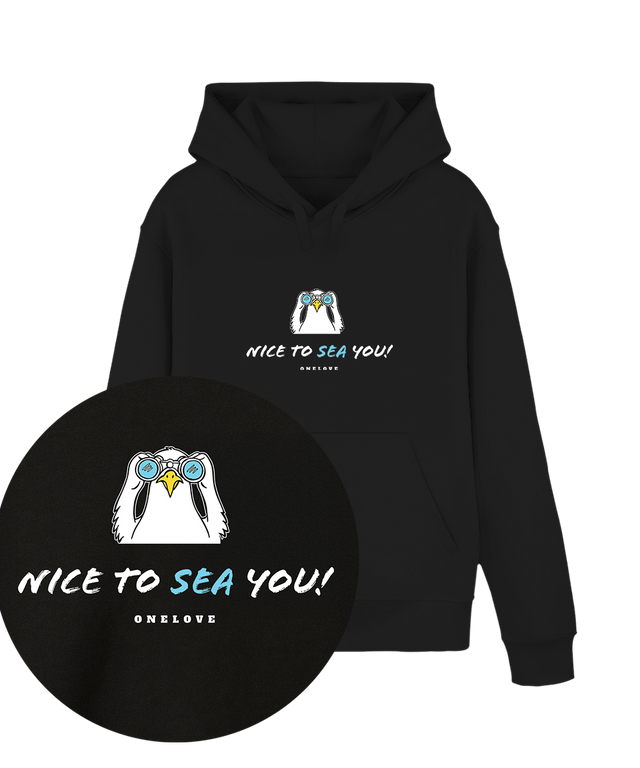 Spüre die Freiheit des Meeres und die Liebe zur Küste mit unserem Hoodie "Nice to sea you!". Dieses einzigartige Design vereint maritimen Humor mit einer Portion Abenteuerlust – ein charmanter Vogel mit Fernglas sucht neugierig den weiten Horizont. Sein Blick lädt dich ein, immer wieder aufs Neue auf Entdeckungstour zu gehen und die Weite des Ozeans ganz nah bei dir zu tragen.