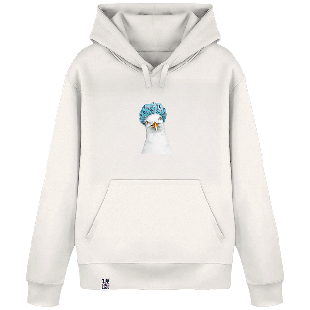 Mit dem Haubentaucher Hoodie von ONELOVE zeigst du deinen Humor und deine Liebe zum Meer auf einzigartige Weise. Die freche Möwe mit der detailreichen, witzigen Duschhaube bringt dir ein Schmunzeln und macht diesen Hoodie zum coolen Hingucker für Alltag und Ausflüge. Der cremeweiße Stoff mit hellblauem Muster und dem sonnigen Orangeton lädt dich ein, deinen maritimen Lifestyle mit Leichtigkeit und Charme zu leben.