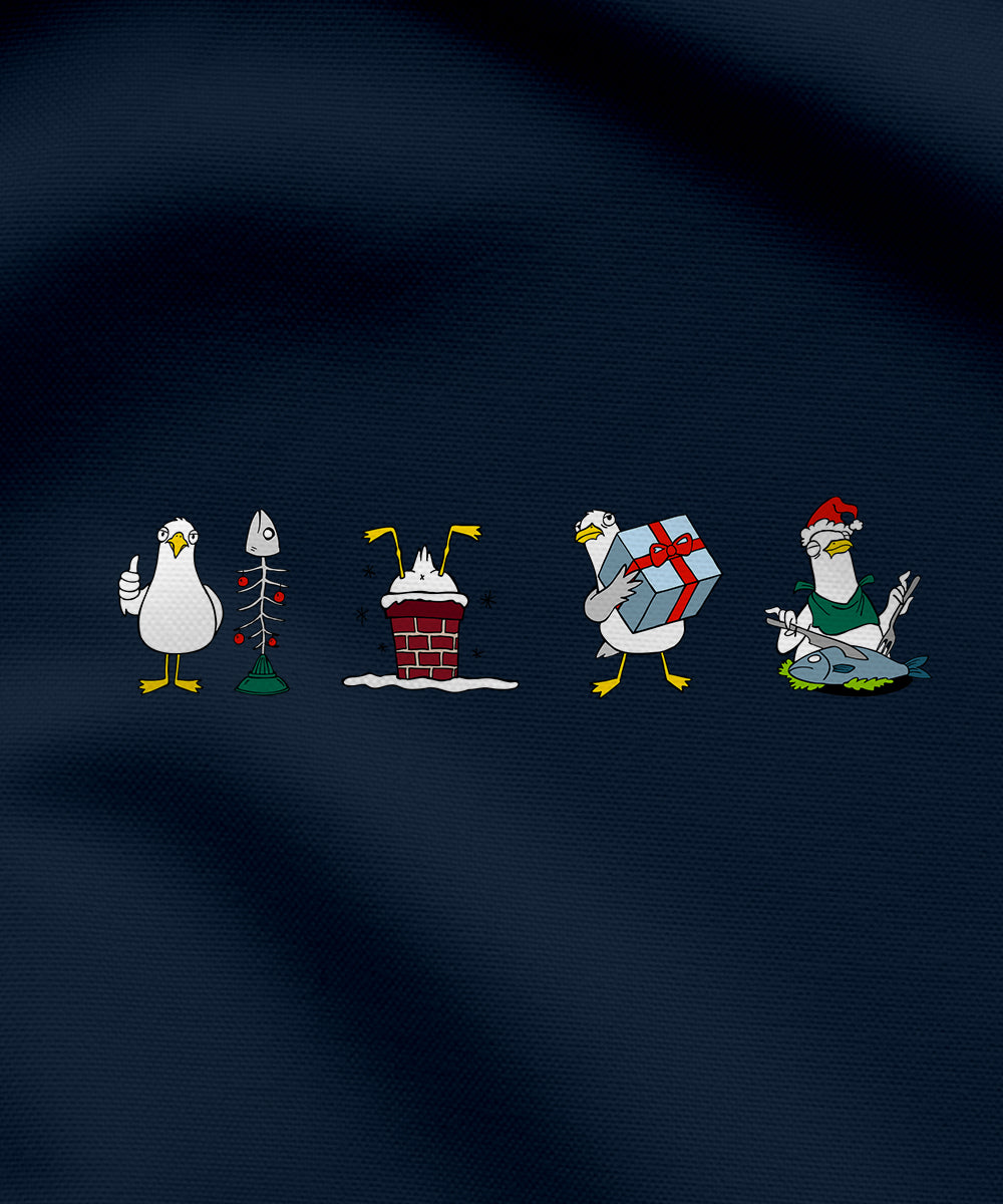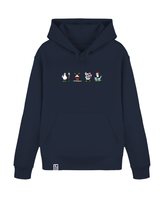Mit unserem "Weihnachtliche Möwenfreude" Hoodie bringst du frischen Wind und eine ordentliche Portion Spaß in die Weihnachtszeit. Das liebevoll illustrierte Design zeigt freche Möwen in skurrilen Weihnachtsszenen – von der Möwe am Baum mit Angelhaken, bis zum lustigen Nikolaus mit Fischgabel. Jeder Blick auf den Hoodie zaubert dir und deinen Liebsten ein Lächeln ins Gesicht.