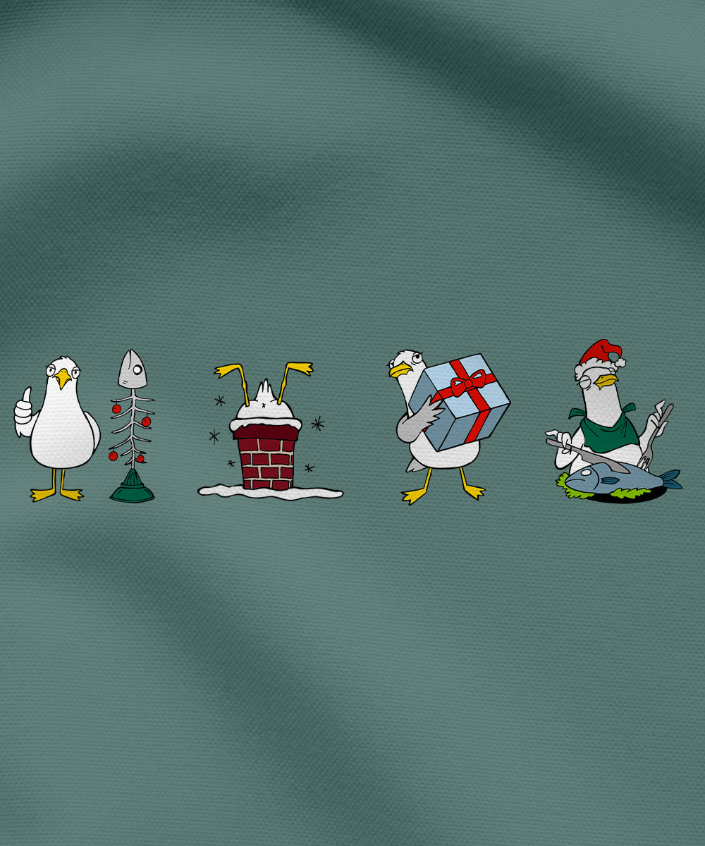 Spüre die frische Brise der Küste und die warme Weihnachtsfreude in diesem einzigartigen Hoodie. Unsere frechen Xmas-Möwen bringen mit ihrem charmanten Comicdesign und den verspielten Details wie Weihnachtsmütze, Geschenken und winterlichen Momenten eine besondere Stimmung direkt in deinen Alltag.
